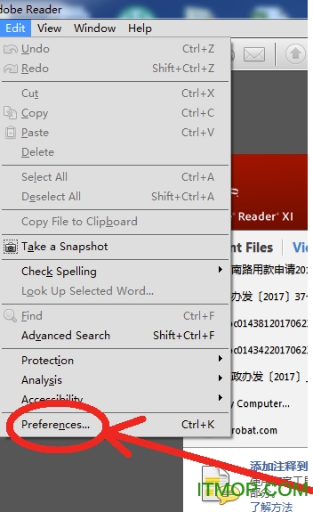 1、还是先打开我们已经安装好的adobe reader工具,然后点击【edit】编辑菜单,如下图: