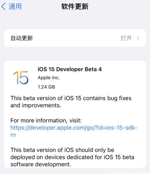 3、iiOS 15测试版描述文件安装完成并重启设备之后,打开 iPhone 的「设置」->「通用」->「软件更新」,之后就可以在线检测到iOS 15最新测试版系统更新了,之后再点击下方的「下载并安装」根据提示,在WiFi网络下,就可以根据完成OTA在线升级系统。