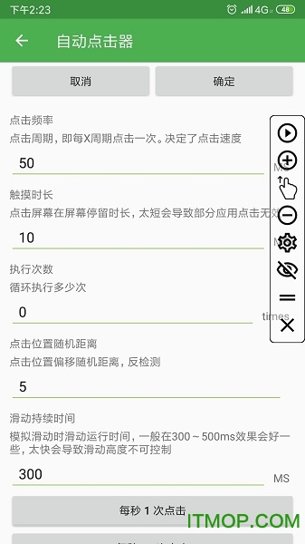 3、长按点击位置的控件会弹出单点的参数配置,可以设置单点的延迟,触摸时长,重复次数