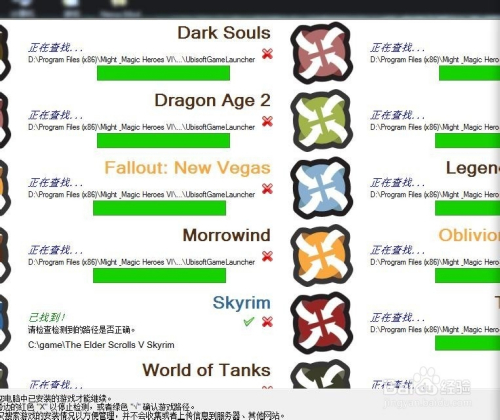 安装nmm时,软件会搜索游戏,这时为了方便,只要搜索到上古卷轴5,就可以关掉其他的搜索,如下图,将skyrim点√,其他直接点×,然后确定安装即可。