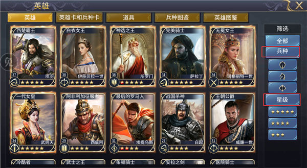 征战全球,麾下又怎少得了智者强将?在英雄之城2手游中,玩家将从“酒馆”中招募到英雄,他们也将在“英雄”系统界面中展示出来。在这里,我们可以深入挖掘麾下帝王、传奇英雄的专长,详细了解各自天赋、技能属性、搭配兵种,从而组建王牌之师。1、主界面下方菜单栏,点击“英雄”即可进入英雄列表页。页面中,按兵种、星级归类,一目了然查看自身拥有的全部英雄。