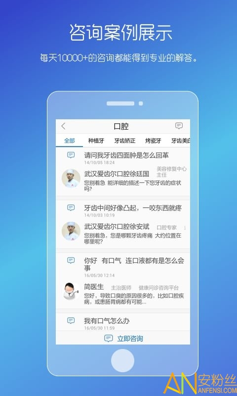 男性私人医生是针对男性生理健康及其他相关专科类病症,提供免费在线咨询的医疗软件。尴尬症状会因为顾虑不方便表述或工作忙碌等原因而忽略去医院。安粉丝本产品集合全国各城市几百家公立医院的优质资源,提供免费且专业的医疗健康咨询;免去挂号难,排队久的困扰,便捷的咨询过程,省时省事,为您的健康生活提供最全面的保护。
