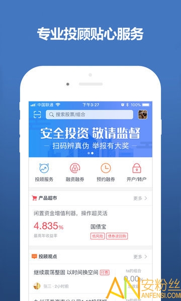 专业的金融投资顾问app——操作简单,优质体验,超爽视觉,适用于所有股票投资者。不断为平台用户提供稳健、便捷、省心的互联网金融产品,让用户畅想方便、多元、安全的财富增值新方式。有专业的理财顾问为用户制定理财规划,并挑选门槛低、高收益、高安全性的理财产品。