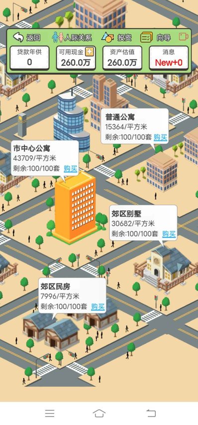 回到2000年买房子中文版是玩法多样的经营手游,玩家可以自由的操作当前的资产,购买地盘来不断的扩建。满足客户们的需求,在经营中赚取更多的钱,成为最富有的地产商。