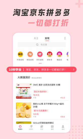 简单好用的省钱神器!淘宝、京东、拼多多、唯品会等各大平台上超过90%的商品都能帮您省钱买到!外卖还能领红包拿返现,精选版块,为您及时提供省钱爆料。用户可随时在线上搜索下单,一键配送。