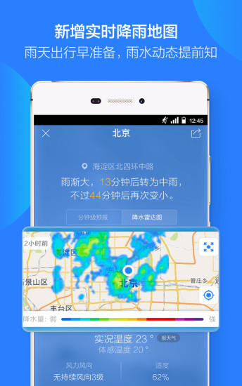 分钟级预报和降水地图——未来降水预报,精准到分钟级别。用户所在街道,每时每刻雨雪变化,尽在掌握;