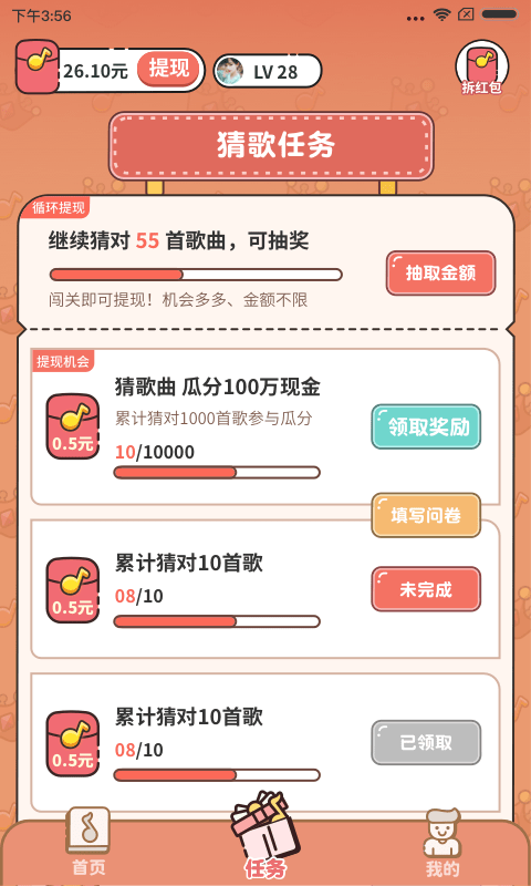 谁是猜歌王,这是一款非常新颖有趣的音乐猜歌类型的小游戏,这款游戏的玩法非常的简单,玩家只需要根据听到的歌曲或者是的节奏来进行猜歌,而且还加入了竞技模式,玩家将会匹配到来自五湖四海的其他玩家进行PK。这款游戏非常的耐玩,有着多种有趣的玩法等你来体验,操作也不是很难。喜欢的玩家就来下载谁是猜歌王试试吧