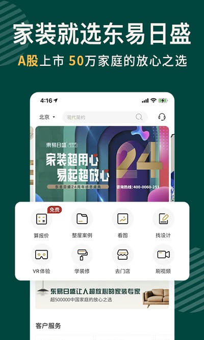 东易日盛app是家装装修平台,平台拥有着丰富的家装经验,能够为用户提供专业的家装服务。在这里你可以找到各种关于家装设计的知识,还有各种家装设计大佬的作品,使你更加了解家装。同时还可以线上预约为你进行家装设计,十分方便。