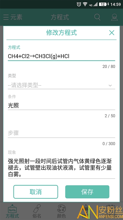 化学方程式app最新版是一款专业的化学学习软件。无论你身处于那个学习阶段,他都能够为提供相应的教学辅助哦!最全面的化学方程式的解析,一切都让你一目了然。快来安粉丝安卓网下载体验吧!