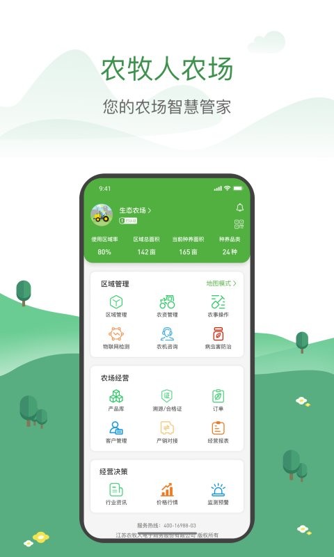 农牧人农场是专为农场管理员打造用于服务农场生产管理的APP;主要为农场提供种植管理、农资库存管理、农事管理、客户管理、订单管理、溯源管理、产销对接、经营报表管理、员工管理、档案管理等服务;帮助农场管理人员,实时查看农场各方面相关数据进展,进行实时数据同步管理,从而更好的带动农场的发展。最终帮助农场实现:种得好、管得好、卖得掉、卖上价、品牌化。