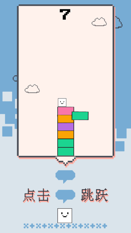 弹跳小方块最新版是一个游戏画风非常清新简约的小游戏,玩法也是非常的简单,玩家只需要控制方块越叠越高就可以了。你要把握好力度和角度,不能让方块坍塌。你有信心堆到100分吗,快来一起挑战吧!!