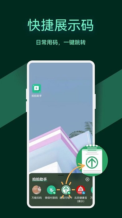 二维码智能扫码,健康码一键展示,应用链接一秒跳转,聊天日程智能识别,拍拍助手,高效随行。利用手机“顶部轻拍”和“背部轻拍”动作,能够快速唤醒APP,完成所有二维码的扫码及跳转。拍拍助手还集成了生活中大多数场景的展示码,如健康宝、付款码、公交地铁码、和个人名片码,使展示码的出示1秒完成,省去了寻找APP的烦恼。