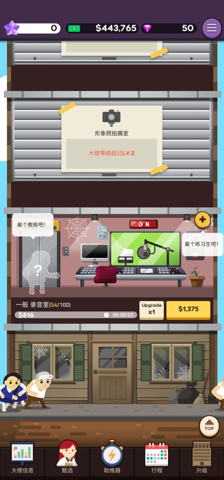 简单点击几次,我也能成为演艺经纪公司的社长?!欢迎来到《超级巨星制作人》!现在,雇佣练习生和导师开始展开演艺事业吧。轻松点击几次就从破旧的经纪公司到超豪华大厦!一切都可实现收集在各种领域活动的91种练习生角色吧!不仅有主唱、舞者还有乐队、古典音乐演奏者、主播和万能艺人!充满才能的练习生们正在等待选秀比赛!