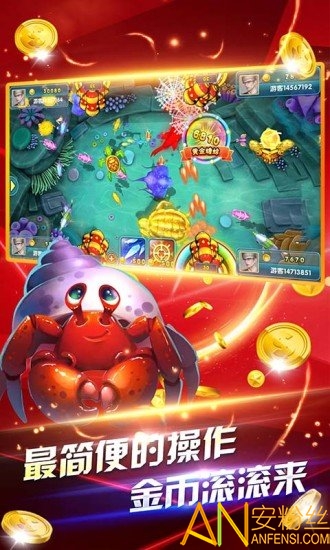 1、精致逼真的画面打造绚烂海洋世界,绚丽生动的鱼群震撼人的眼球,华丽诙谐的音乐让人身临其境,10种渔炮任意选体验捕捉快感.