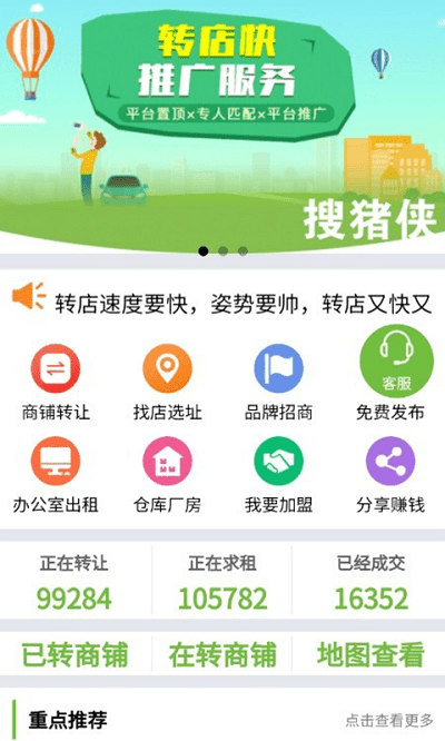 立即下载 搜猪侠找店转店app 分类:生活健康 大小:52.0M 语言:中文 版本:v1.2.4安卓版 时间:2023-01-18 13:13:03 手机扫码免费下载 #搜猪侠找店转店app简介 搜猪侠找店转店app这是一款针对商家店铺租转平台,商家入驻,上传资料和编辑发布店铺信息,随时查看咨询情况,找店铺的商家就可以根据个人情况,在线选店铺,与铺主进行沟通,需要的用户表赶快下载吧!搜猪侠找店转店最新手机版介绍搜猪侠找店转店平台提供地图定位功能,锁定商圈展现附近在转店铺和已转店铺,信息发布平台提供商铺、门面、仓库厂房 、写字楼出租转让信息发布平台。 租赁app,店铺app,