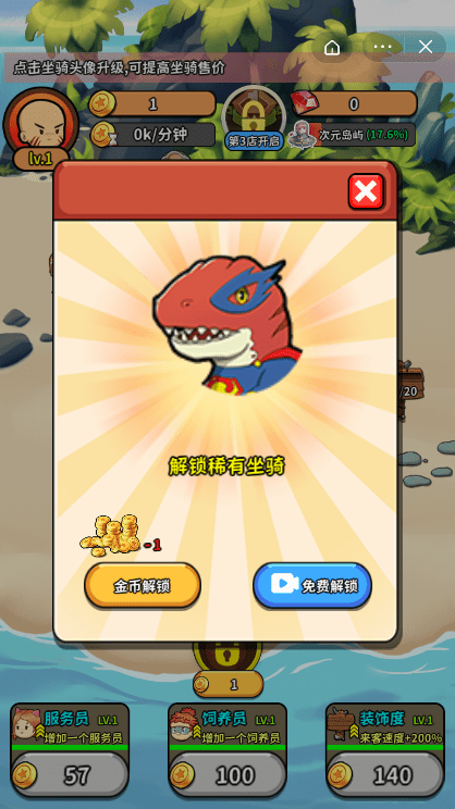 老板来只坐骑吧游戏是一款放置玩法的养成游戏,竖屏简单的操作方式,玩家可收集各种类型的恐龙打造自己的恐龙乐园,还可以收集到非常稀有的恐龙哦,或者升级你的建筑加速发展的效率,玩法简单轻松,感兴趣的朋友就来看看吧。