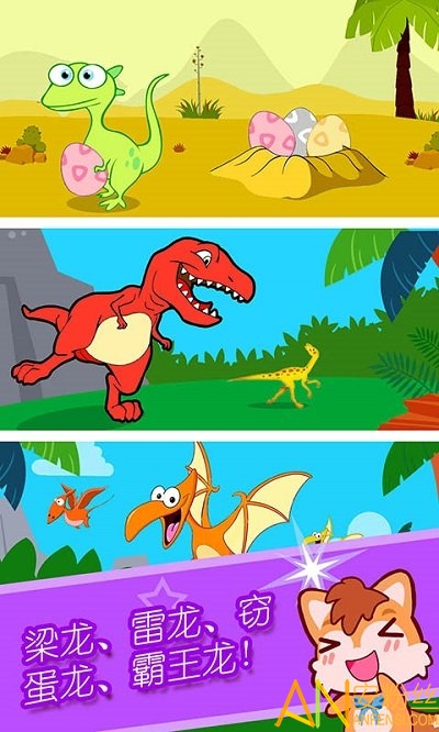 1.这里有霸王龙、翼龙、迅猛龙、始盗龙、三角龙、异特龙、剑龙等多种恐龙等你来发现挖掘,小朋友,快来恐龙乐园和不同的恐龙玩耍吧!