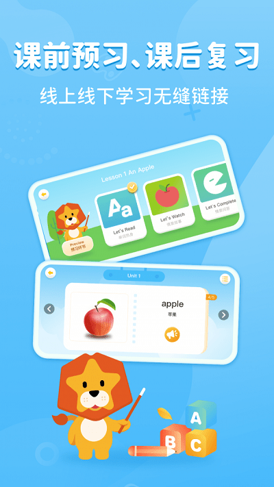 晓狮app是实用的线上教学培训类软件,结合当下课本知识内容不断优化和丰富,涵盖英语教学体系内容,让孩子们能够更好的来学习和掌握英语知识内容,来保障学习的效果,不断优化提升学习成绩,有需要的用户一起来看看吧!