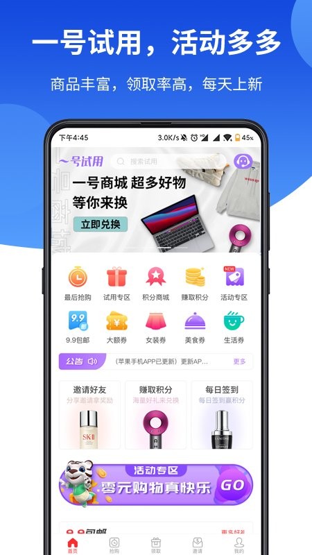 立即下载 一号试用平台 分类:购物时尚 大小:19.7M 语言:中文 版本:v2.4.04安卓官方版 时间:2023-02-20 13:26:45 手机扫码免费下载 #一号试用平台简介 一号试用抢单软件是由浙江众鑫空间科技有限公司开发的非常好用的手机购物类应用软件,平台汇集了海量优质的商品资源,种类非常的齐全,用户通过app就可以在线选购,非常的方便快捷,感兴趣的小伙伴们快来下载体验吧。一号试用app内容介绍非常实用的手机购物软件,通过这个应用软件用户可以进行领取诸多的试用商品进行使用,这里有精品女装、时尚男装、鞋靴箱包、配饰配件、家居家纺、数码家电和母婴用品等优质产品。价格也很实惠,用户随时购买都非常划算。 商城app,优惠app,