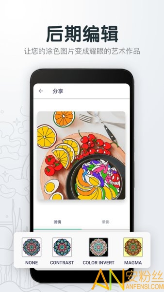 填色解压绘图本是一个真正的绘图涂色减压应用,每张涂色页都有着独特的设计和各种形状大小的曼荼罗,动物、花卉、地点、食物和其他更多设计分门别类排列;还可将自己的照片转换为草图,进行涂色绘画创作!让您释放压力,获得更好的感觉,同时让自己体验一把珍贵的童真乐趣和幸福瞬间,释放创造天赋。填色解压绘图本魔法般地重现了铅笔、蜡笔和画刷在涂色页上的触屏绘图绘画乐趣,您的手机即刻转变为精进绘画技能的休闲工具