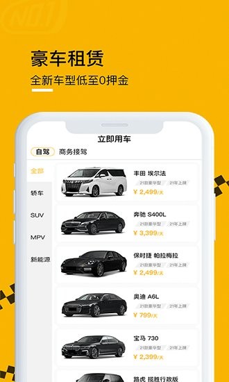 壹号云车出行平台app是一款现在大家都在用的手机租车软件,在这里有着各种免押金的汽车租赁服务,你还可以看到各种各样的豪车可以进行租赁,用户可以在软件中订车线上去取,你还可以下送车上门的服务,非常实用的软件。