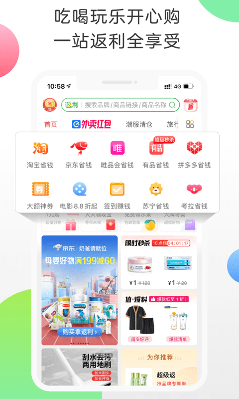 拥有返利网APP,线上线下,衣食住行,吃喝玩乐,随时随地,轻松省钱拿返利,省钱省时间!