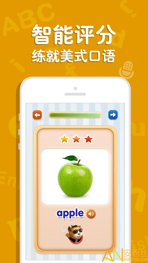 5.美式发音: 每个单词都有标准美式发音,设计了发音练习以及人工智能评分的功能,让孩子经过练习,可以发出标准的美式口音。只有会说,才算是真正掌握。
