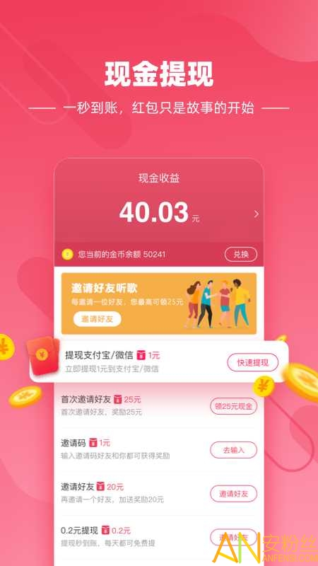 这里听音乐同时,你还会有机会获得现金红包,帮助你快速的赚取到不同的零花钱!