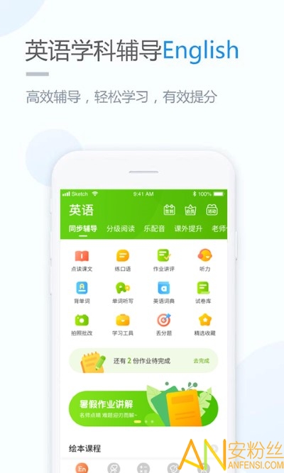 课本点读、练口语、作业辅导、绘本课程、考试测评、早读课程、课前预习、课后巩固、阅读训练、语法训练、听力训练、每日英语、老师作业、丢分题、精选收藏、听力、欧美课程、学习工具、乐配音、乐配音测评、词典