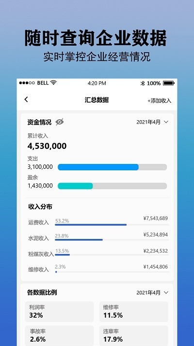 好运车队管理app对运费收入分布进行详细的统计,可以对企业的经营情况实时掌控,各个数据比例一查便知,同时提供了维修、保险、违章、事故、加油、ETC、工资管理等板块。