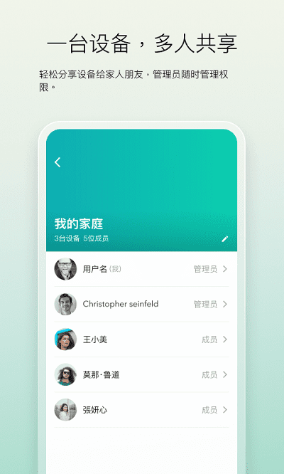 3、一台设备多人共享,通过管理设置,让所有的家人都可以操控设备;