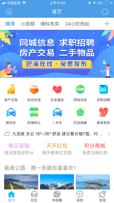 巴渝在线app是专为重庆地区打造的生活服务平台,涵盖了吃喝玩乐、二手交易、房产交易、同城信息等板块,在这里为你推送最新、最热的资讯,各种短视频随心刷、可自由参与各种话题讨论。