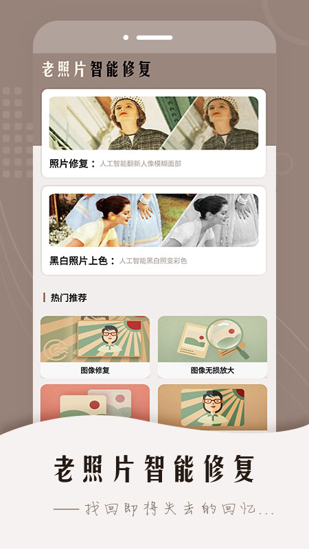 老照片智能修复软件是一款帮助用户将老旧照片修复保存下来的app,可以对照片进行无损放大,让小尺寸的照片放大后依旧清晰,对照片的颜色也能够进行适当的修饰还原,是非常好用的修复工具。