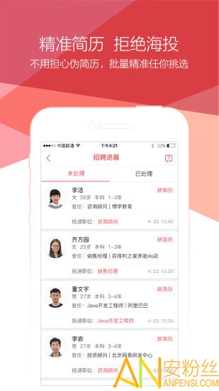 香聘app这是一款找工作、求职类的app,在这里你可以了解到周边最详细的工作机会,求职者与企业都可以使用,职业种类多,机会多,一键投递简历,你可以在软件上与hr取得联系,邀约面试。同时软件提供的工作信息地区包括广泛,可以找到你想进入的大部分公司资讯,找到合适的最佳工作,需要的用户可以在安粉丝手游网下载体验。