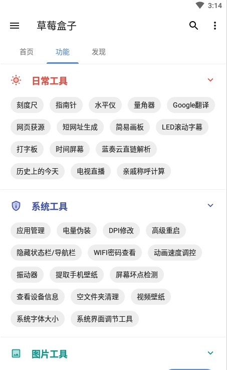 草莓盒子app这是一款非常好用的多功能工具箱,内置多种好用的便捷工具,满足不同场合中的需求,并且还可以在线查找网站以及下载电视直播软件和游戏辅助工具,功能多多,等你发现,需要的用户就赶快下载吧!