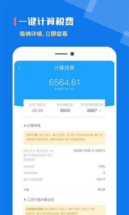【一键查询扣税】只需输入工资薪金、五险一金、专项附件扣除,一键为您计算所需缴纳的个税。不懂专项附件扣除怎么算?只需选择符合标准享受的六项专享附加扣除:子女情况、继续教育、赡养老人、租房租金等情况,就能自动帮助您计算出专项附加扣除金额,个税计算不再愁。
